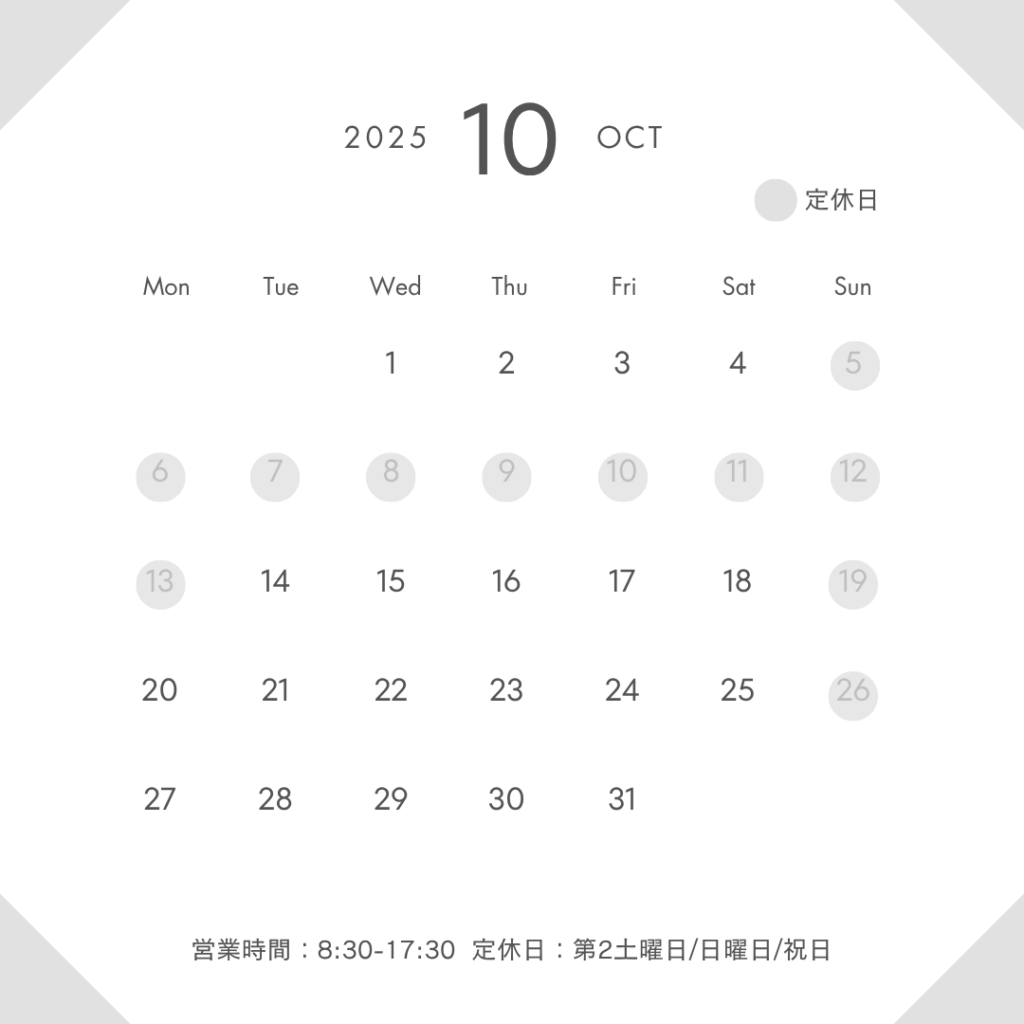 10月の定休日につきましては、下記カレンダーをご確認ください。
