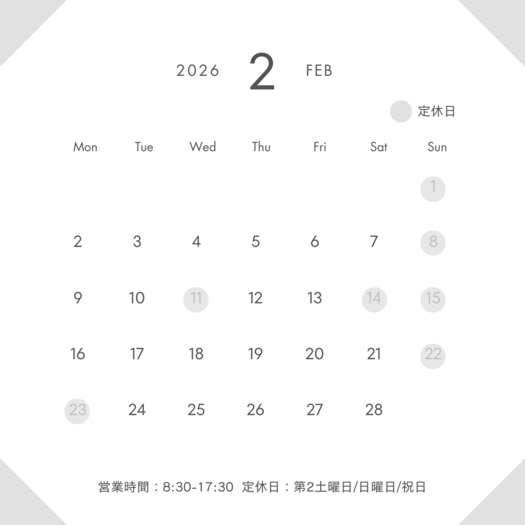 2026.02.02 ご案内 2月の定休日のお知らせ 日頃よりご愛顧いただき、誠にありがとうございます。2月の定休日につきましては、下記カレンダーにてご確認ください。 お客様にはご不便をおかけすることもあるかと存じますが何卒ご理解のほどよろしくお願いいたします。引き続きのご愛顧を賜りますようお願い申し上げます。 ページ送り 一覧へ戻る 前の記事へ 次の記事へ