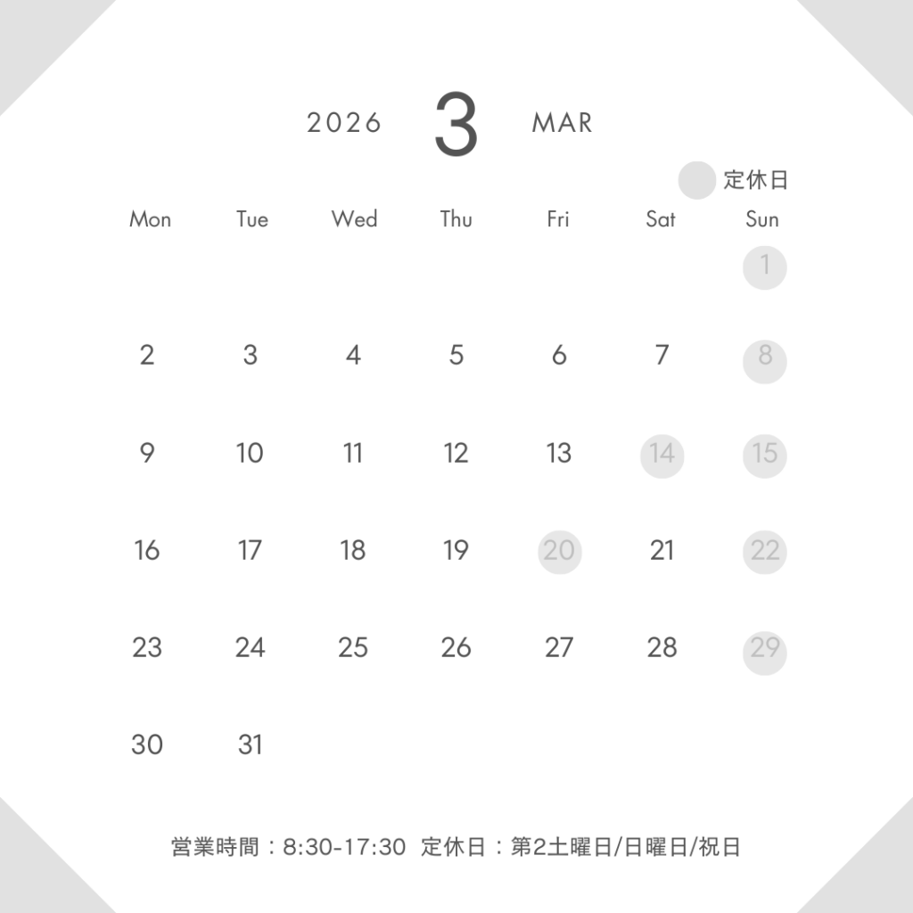 2026.02.27 ご案内 3月の定休日のお知らせ 日頃よりご愛顧いただき、誠にありがとうございます。3月の定休日につきましては、下記カレンダーにてご確認ください。 お客様にはご不便をおかけすることもあるかと存じますが何卒ご理解のほどよろしくお願いいたします。引き続きのご愛顧を賜りますようお願い申し上げます。 ページ送り 一覧へ戻る 前の記事へ 次の記事へ