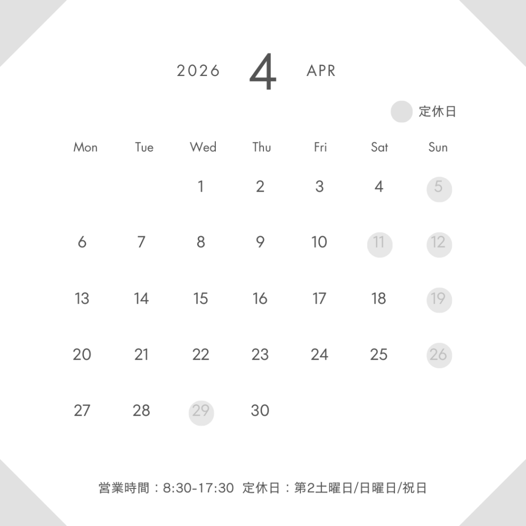 4月の定休日につきましては、下記カレンダーにてご確認ください。